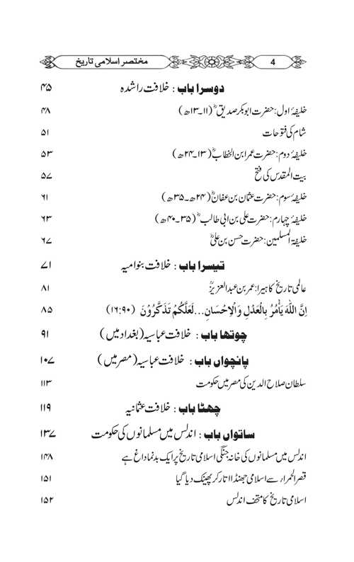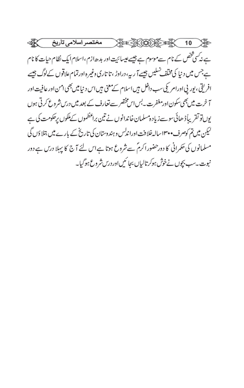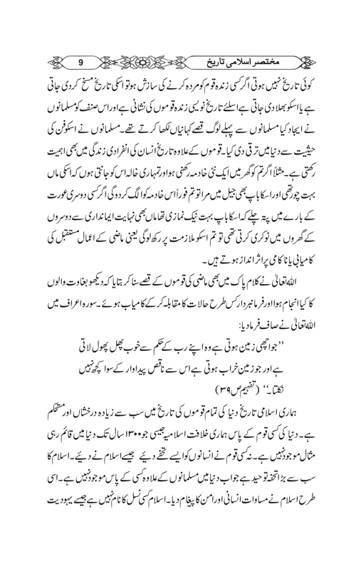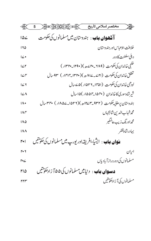 This is a unique book on Islamic History which starts from Adam(A.S) and go through the middle ages and ends 1899. The book has pictures and photographs of important Islamic places,rulers,scholars,scientists,buildings and maps. For readers’ convenience, the soler calender is used besides Islamic dates.