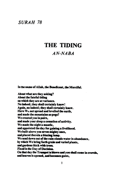 One exception is the retention of the term surah, which indicates a separate and independent part of the Qur’an An obvious English term which may be suggested for it is chapter But chapter is inadequate as a substitute for Surah because a chapter is supposed to deal with a single topic. None of the longer surahs of the Qur’an is confined to the discussion of one single idea. Furthermore, the Arabic term is used to refer to parts of the Qur’an only. No other book is divided into surah, not even the books of the Prophet’s traditions. Since it is a special word in Arabic, its retention in the English edition is unavoidable.