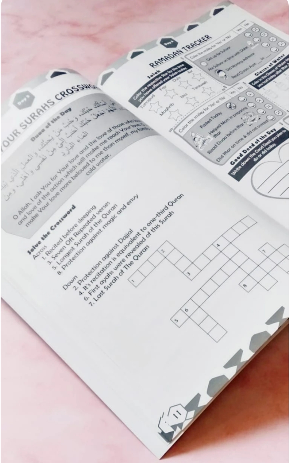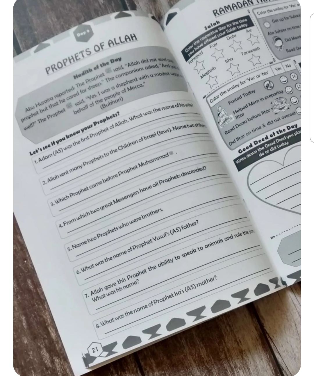 This Ramadan Journal contains funfilled, mind-racking activities on a range of topics including Salaah, Sahaba, Prophets, Allah, Ramadan etc. There are craft activities, daily Duaas, daily Good Deeds, NAsheed, story, Journalling pages, tracker, and much more.