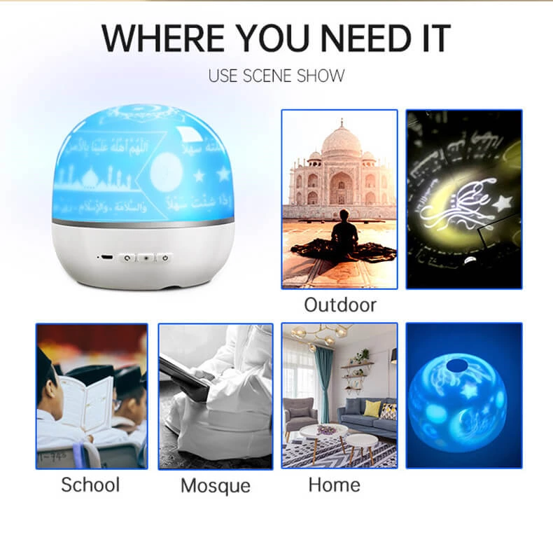 Rotating Projection Lamp Quran Speaker – SQ526 by Equantu is an innovative Islamic learning device that combines modern technology with traditional teachings. Designed to enhance your Quran learning experience, it features complete Quran recitation with 18 renowned reciters and translations in 14 languages. With word-by-word Ayah playback and Sahih Bukhari, Hisnul Muslim, and Tafseer Sharavi audio, it caters to every Islamic need.