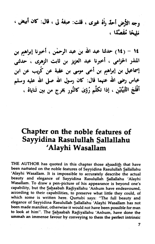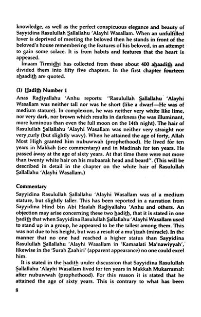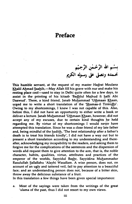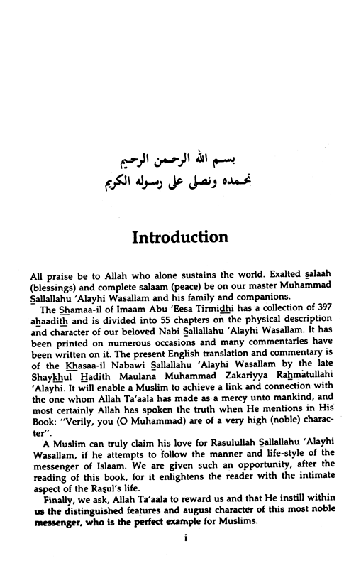 This humble servant, at the request of my master Hadrat Maulana Khalil Ahmad Sahib,-May Allah fill his grave with our and make his resting place cool-used to stay in Delhi quite often for a few days, assist in the printing of his kitaab ‘Badhlul Majhud fi Halli Abi Daawud’. There, a kind friend, Janab Muhammad ‘Uthmaan Khaan, urged me to write a short translation of the ‘Shamaa-il Tirmidhi’. Owing to my shortcomings, I knew I was not capable of this. Also, before this, I did not have an opportunity to either write a book or deliver a lecture. Janab Muhammad ‘Uthmaan Khaan, however, did not aCCept any of my excuses, due to certain kind thoughts -he held regarding me. By virtue of my shortcomings I would never have attempted this translation. Since he was a close friend of my late father and, being mindful of the hadith, ‘The best relationship after a father’s death is to treat his friends kindly’, I did not have a way out but to present a short translation aCCording to my understanding and there-after, acknowledging my incapability to the readers, and asking them to forgive me for the complications of the sentences and the dispersion of words and request them to give attention to the aim, that is, the noble character, habits, qualities, virtue, attributes and practices of the emperor of the worlds, Sayyidul Bashr, Sayyidina Muhammadur Rasulullah Sallallahu ‘Alayhi Wasallam. A wise person, does not, on aCCount of an ugly and tattered veil, fail to pay attention to a beautiful face; and an understanding person does not, because of a bitter skin, throw away the delicious substance of a fruit.