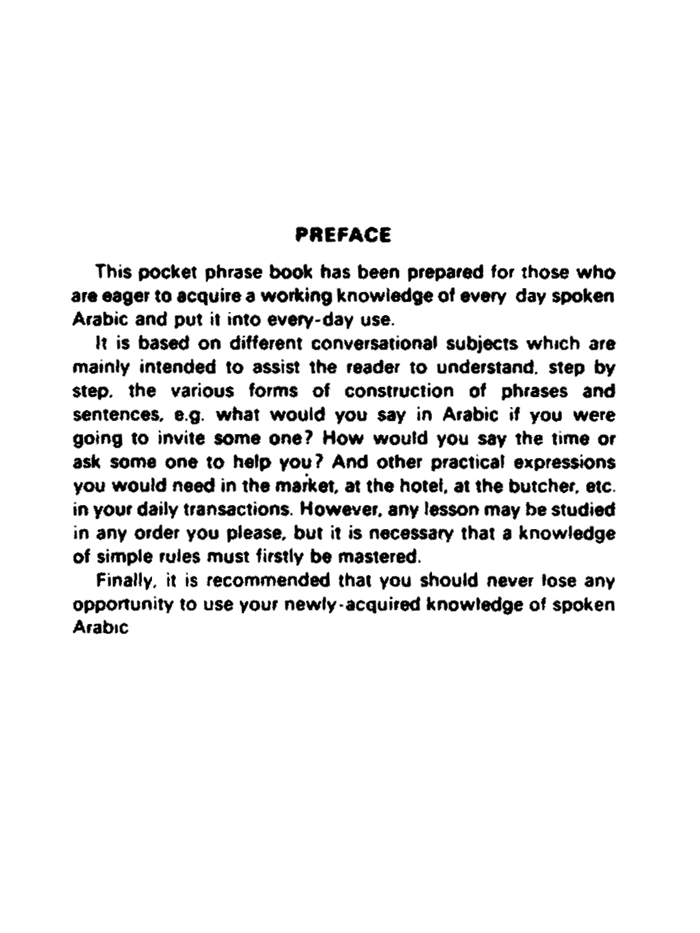 “PREFACE – This pocket phrase book has been prepared for those who are eager to acquire a working knowledge of every-day spoken Arabic and put it into every-day use.