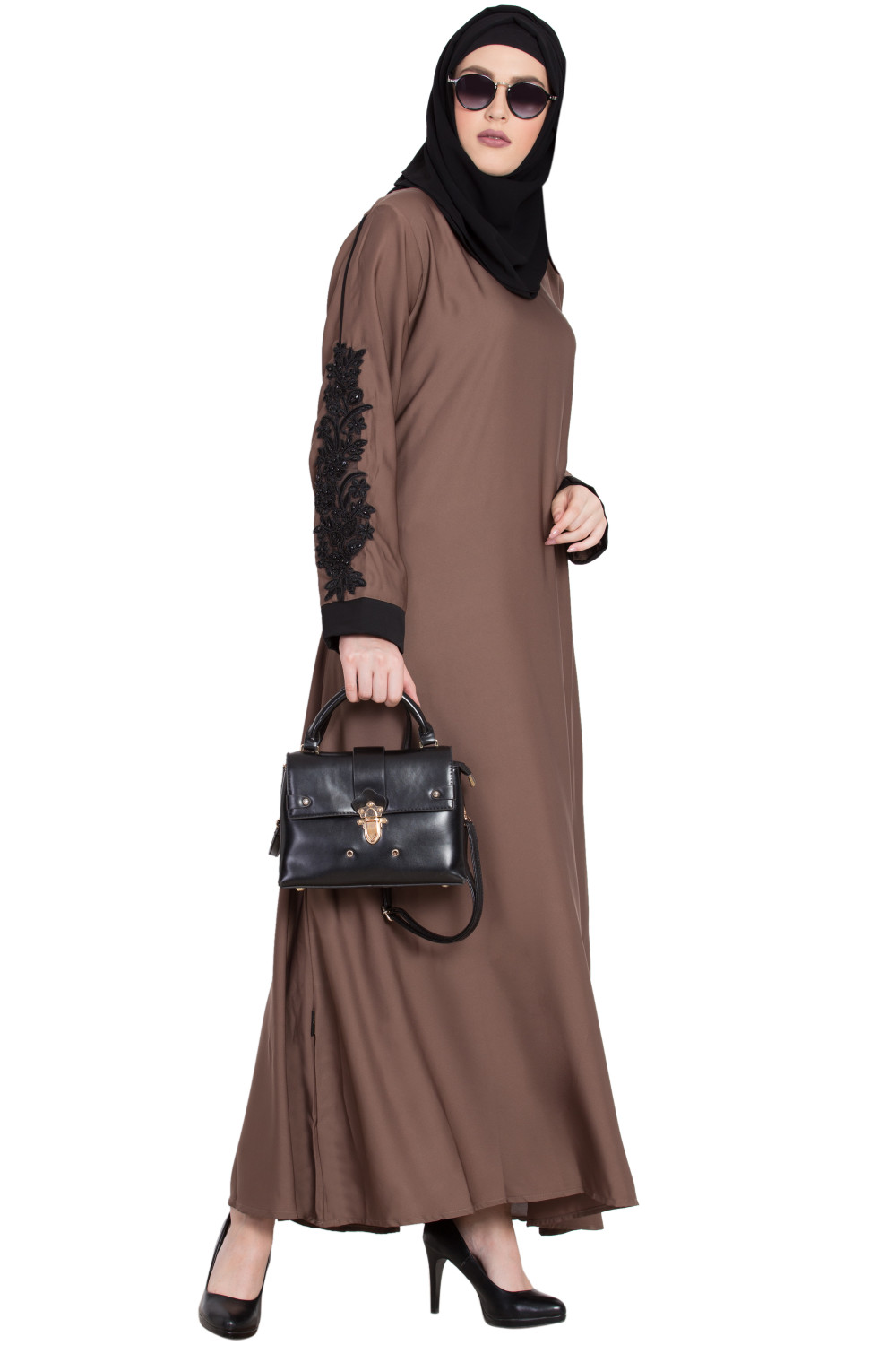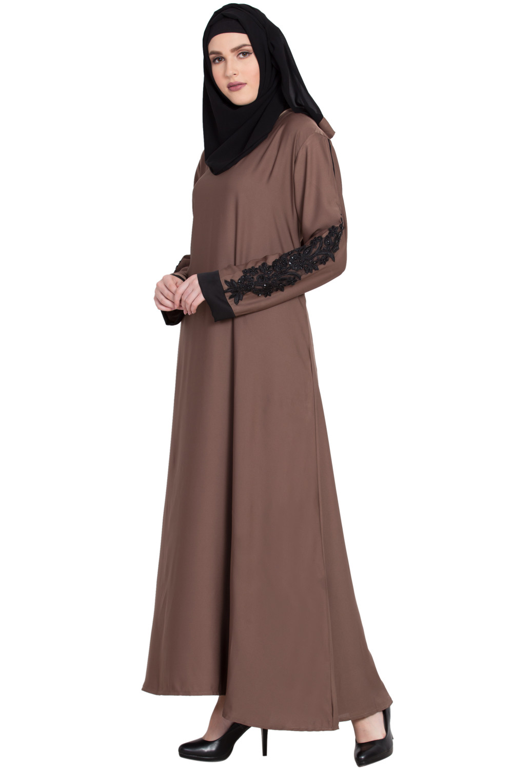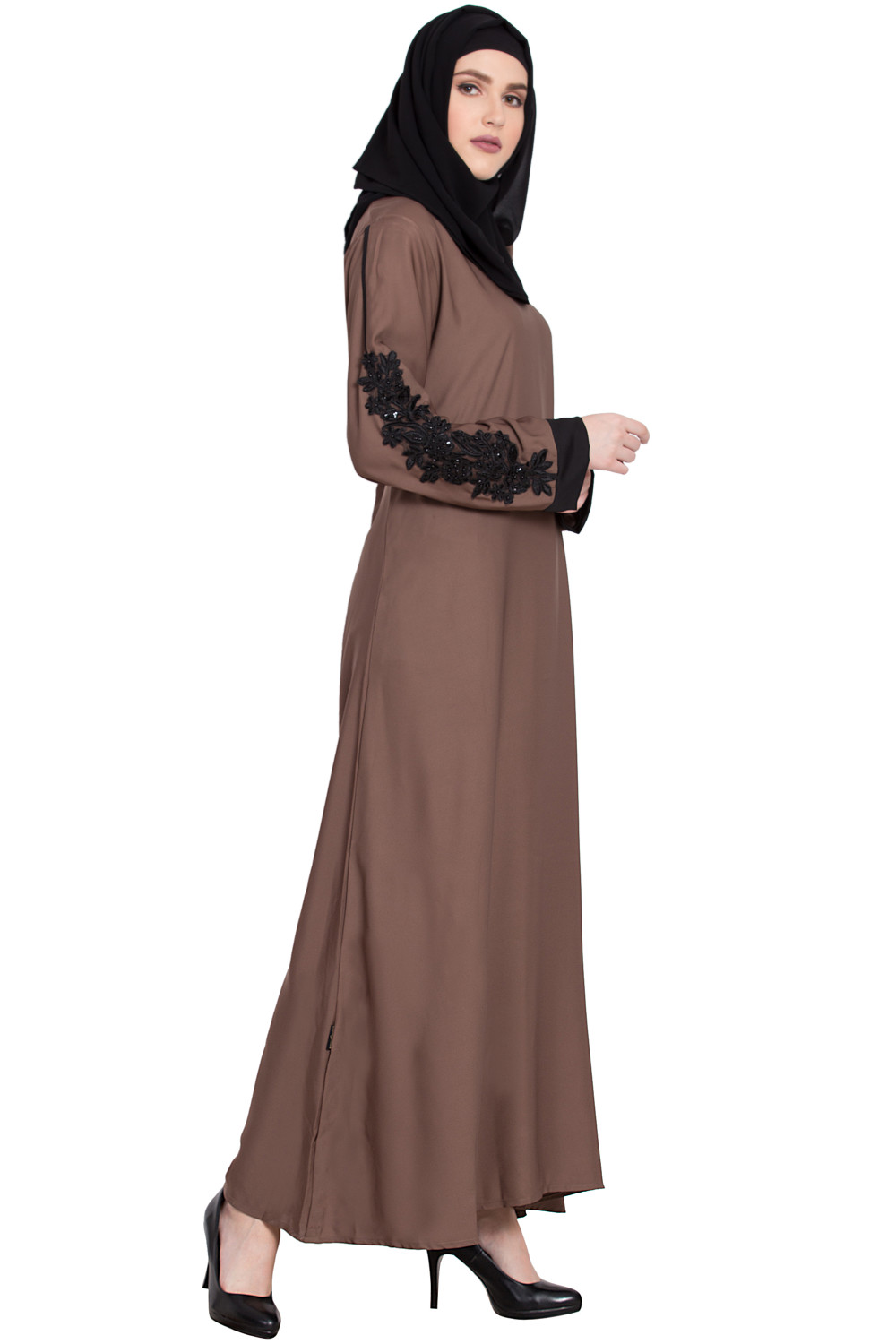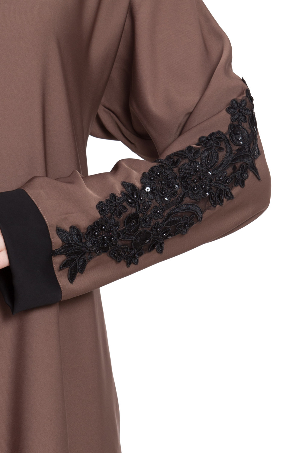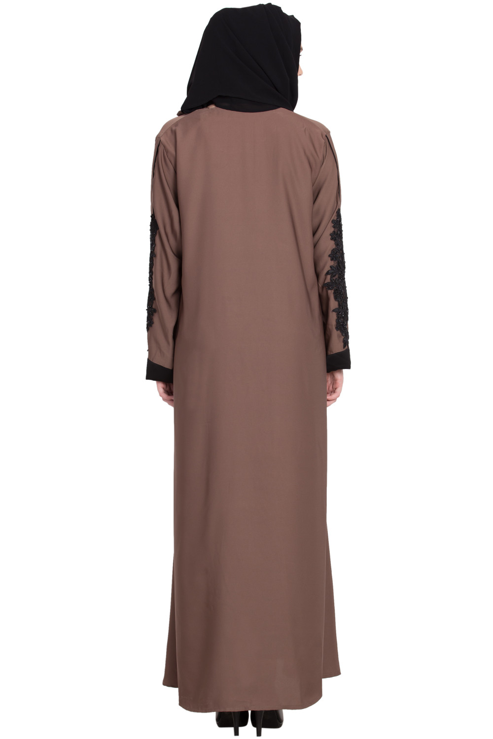 This closed A-shaped abaya prioritizes ease and modesty. The front remains uninterrupted by buttons or zippers, maintaining a clean, minimalist line that’s both practical and elegant. The standout detail is the patchwork on the sleeves—tastefully placed accents that add dimension, texture, and a hint of color without overwhelming the design. It’s a thoughtful touch that elevates the abaya from simple to special while keeping it wearable day to night.
