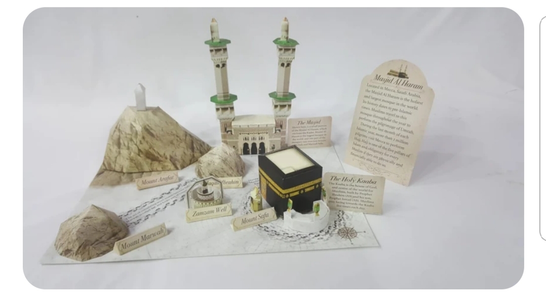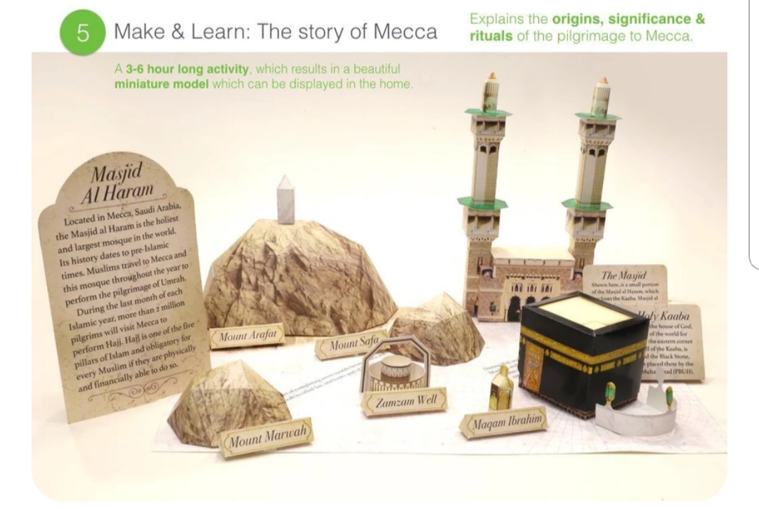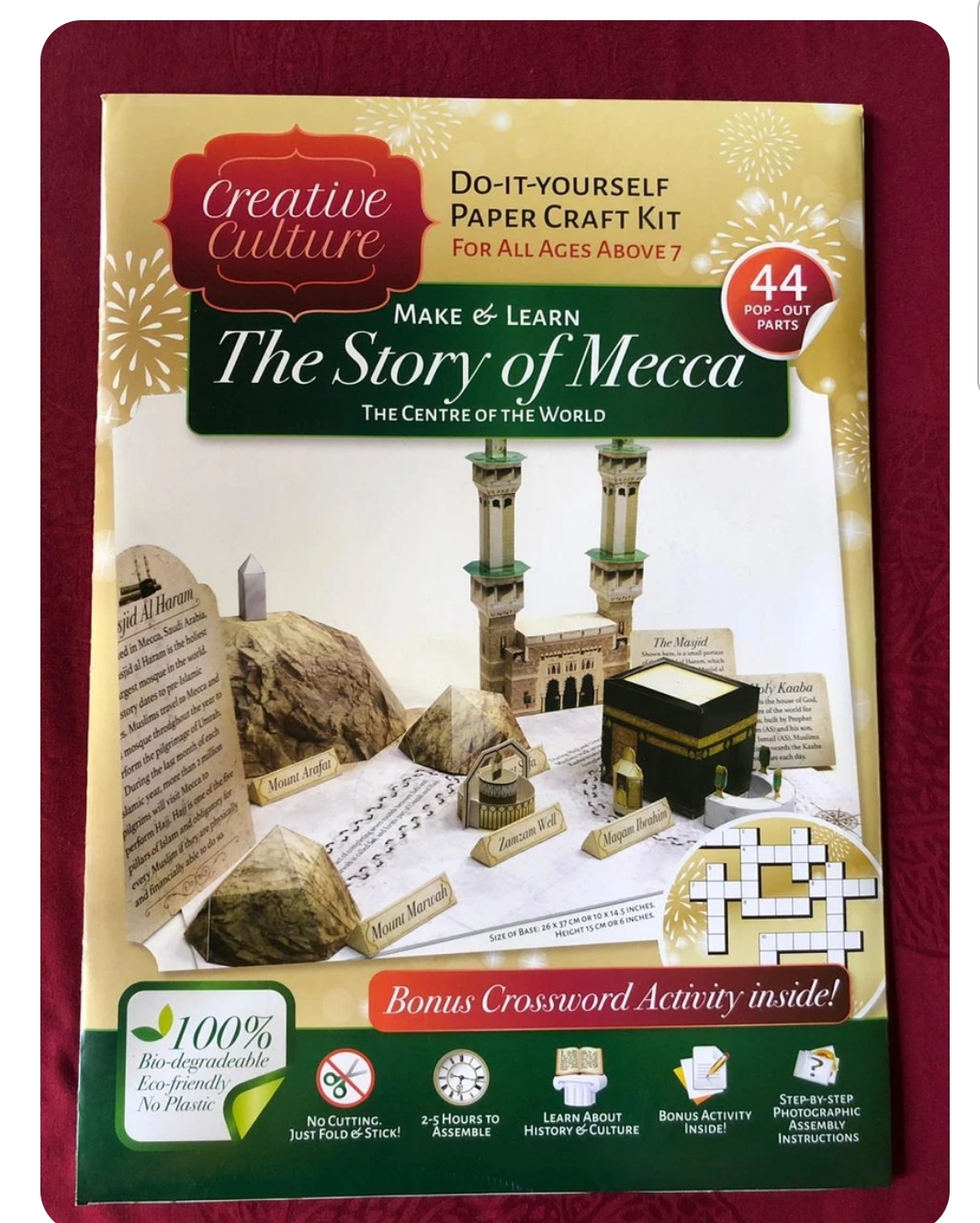 Make & Learn: The story of Mecca, the Centre of the World Explains the origins, significance & rituals of the pilgrimage to Mecca. A 3-6 hour long activity, which results in a beautiful miniature model which can be displayed in the home. It is 100% biodegradable. No plastic.It contains 44 pop out parts. No cutting. Just fold and stick.. Also a bonus activity inside.