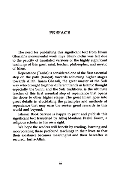 Repentance (Tauba) is considered one of the first essential step on the path (tariqat) towards achieving higher stages towards Allah. Imam Ghazali, the great master of the Sufi way who brought together different trends in Islamic thought especially the Sunni and the Sufi traditions, is the ultimate teacher of this first essential step of repentance that opens the doors to other higher stages. The great Imam goes into great details in elucidating the principles and methods of repentance that may earn the seeker great rewards in this world and beyond. We hope the readers will benefit by reading, learning and incorporating these profound teachings in their lives so that their existence becomes meaningful and their hereafter is secured, Insha-Allah.