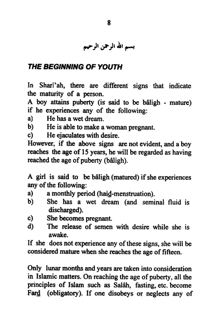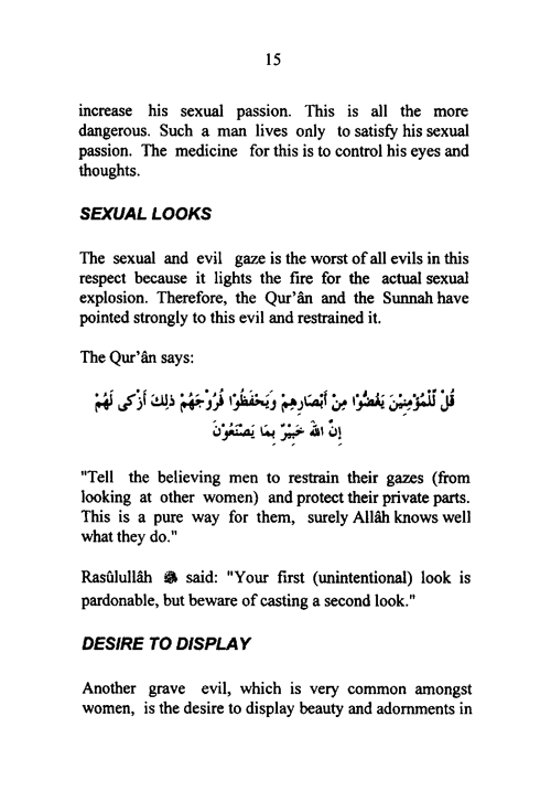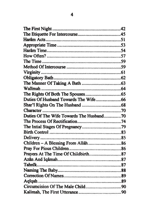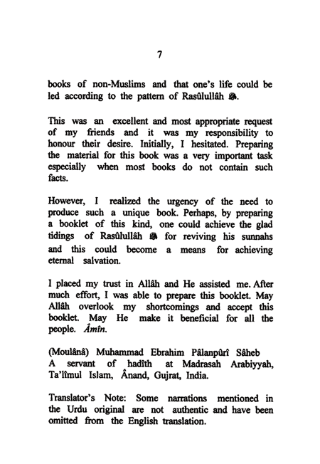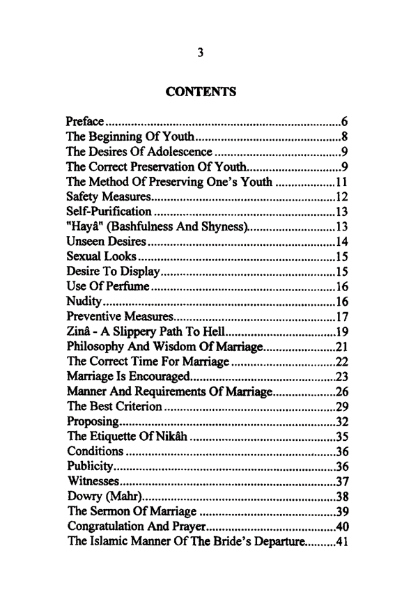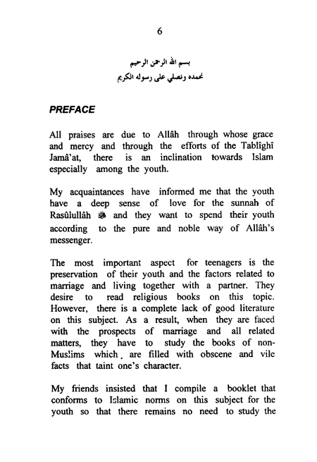 All praises are due to Allah through whose grace and mercy and through the efforts of the Tablighi Jama’at, there is an inclination towards Islam especially among the youth. My acquaintances have informed me that the youth have a deep sense of love for the sunnah of Rasulullah (PBUH) and they want to spend their youth aCCording to the pure and noble way of Allah’s messenger. The most important aspect for teenagers is the preservation of their youth and the factors related to marriage and living together with a partner. They desire to read religious books on this topic. However, there is a complete lack of good literature on this subject. As a result, when they are faced with the prospects of marriage and all related matters, they have to study the books of non-Muslims which are filled with obscene and vile facts that taint one’s character. My friends insisted that I compile booklet that confirms to Islamic norms on this subject for the youth that there remains no need to study the so books of non-Muslims and that one’s life could be led aCCording to the pattern of Rasulullah (PBUH). This was an excellent and most appropriate request of my friends and it was my responsibility to honour their desire. Initially, I hesitated. Preparing the material for this book was a very important task especially when most books do not contain such facts. However, I realized the urgency of the need to produce such a unique book. Perhaps, by preparing a booklet of this kind, one could achieve the glad tidings of Rasulullah (PBUH) for reviving his sunnahs and this could become for achieving a means eternal salvation.I placed my trust in Allah and He assisted me. After much effort, I was able to prepare dais booklet. May Allah overlook my shortcomings and aCCept this booklet. May He make it beneficial for all the people. Ameen. (Moulana) Muhammad Ebrahim Palanpuri Saheb A servant of hadith at Madrasah Arabiyyah, Ta’limul Islam, Anand, Gujrat, India. Translator’s Note: Some narrations mentioned in the Urdu original are not authentic and have been omitted from the English translation. (Author)