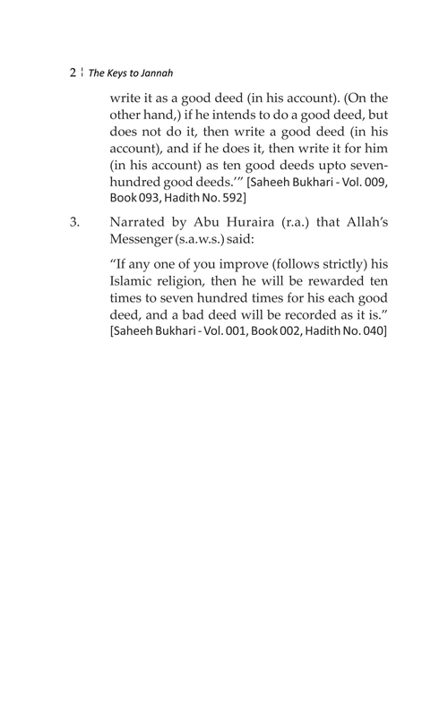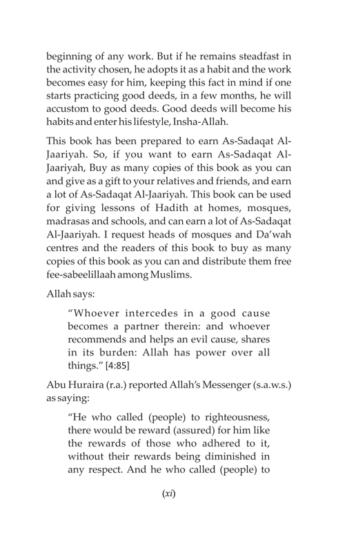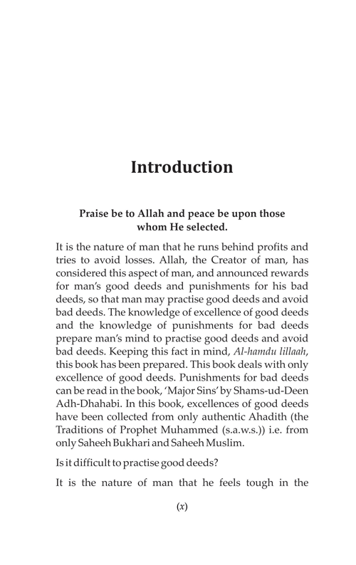This book deals with collection of selected hadiths from only authentic Ahadith, with a special focus on why it’s important to practice good deeds, as the good deeds are the keys to Jannah. It’s our duty to practice good deeds in our habits and embed them into our lifestyle. This book has been prepared with the intention to earn As-Sadaqat Al-Jaariyah. In order to earn As – Sadaqat Al-Jaariyah refer this book to as many people, or as gifts to family and friends. This book can be used for giving lessons of Hadith at homes, Mosques, Madarsas and School.
