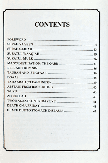 In this kitaab, four such Surahs have been mentioned which Rasulullah Sallallahu Alayhi Wasallam instructed his beloved Ummah to read between Maghrib and bed time. Read these four Surah every night, whether you be at home or on a journey. Read it yourself, and ask all your family members to do the same. The person who reads these four Surah every night will receive an abundance in reward. Among other things, he will, Inshaallah, be pardoned by Allah; receive a reward equal to reading the entire Quraan ten times; die as a shaheed (martyr); be protected from starvation and poverty, receive a reward equal to staying awake and making Ibaadah during the night of Laylatul-Qadr; and above all be protected from the Azaab of the Qabr (punishment of the grave) and the Aakhirah.