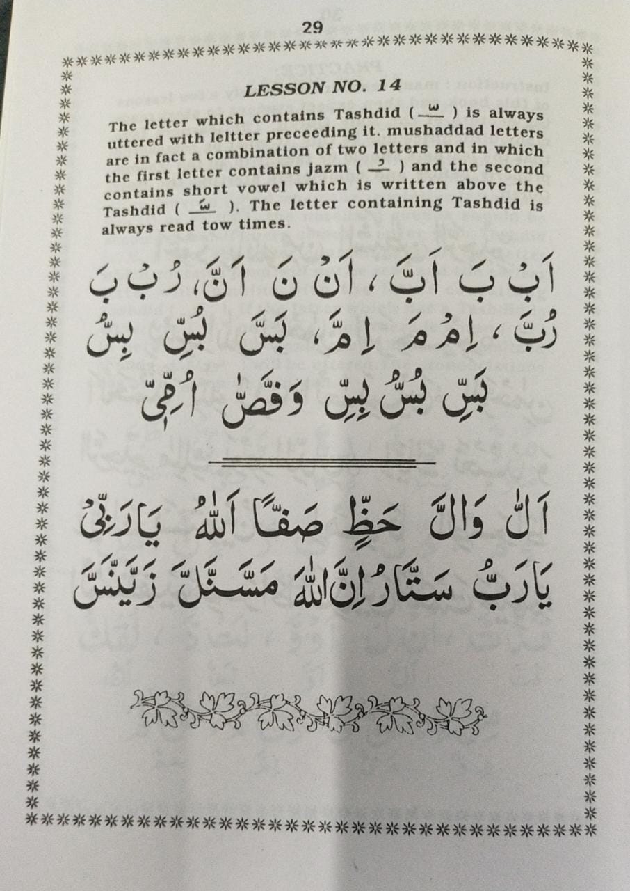 There is no doubt in it that with the help of this Yassarnal Quran children come to know how to read the Holy Quran in about four to five months with ease and comfort. It is noticed that many published exercise books for children have got very difficult lessons in the first few sections. this arrangemnts of lessons encourage them to go through the total lessons of this exercise book.